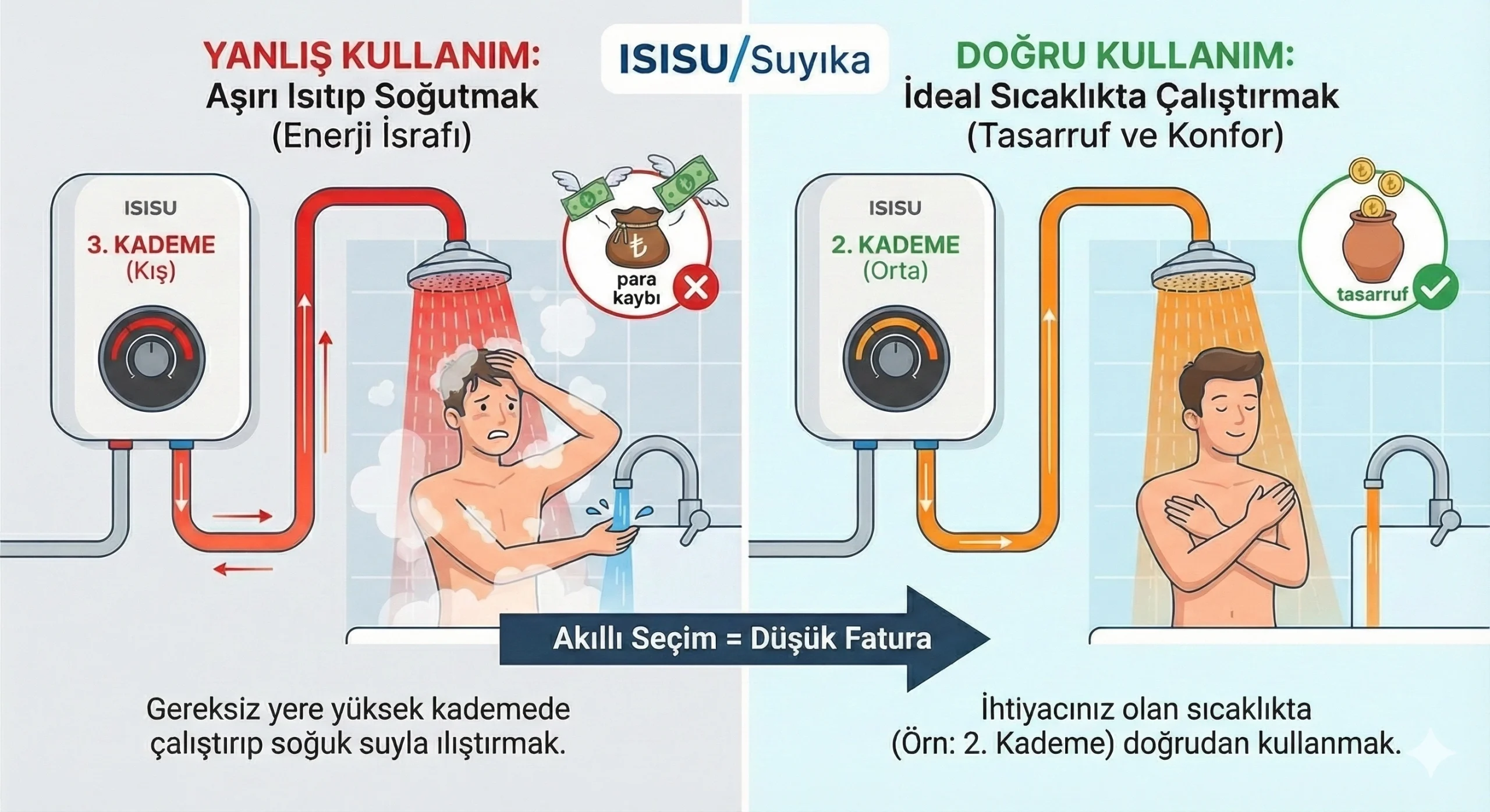 - Su Debisini Ayarlayın: Suyu sonuna kadar açmak yerine, yeterli miktarda açmak suyun daha çabuk ısınmasını sağlar, böylece daha düşük kademede aynı sıcaklığı alabilirsiniz.