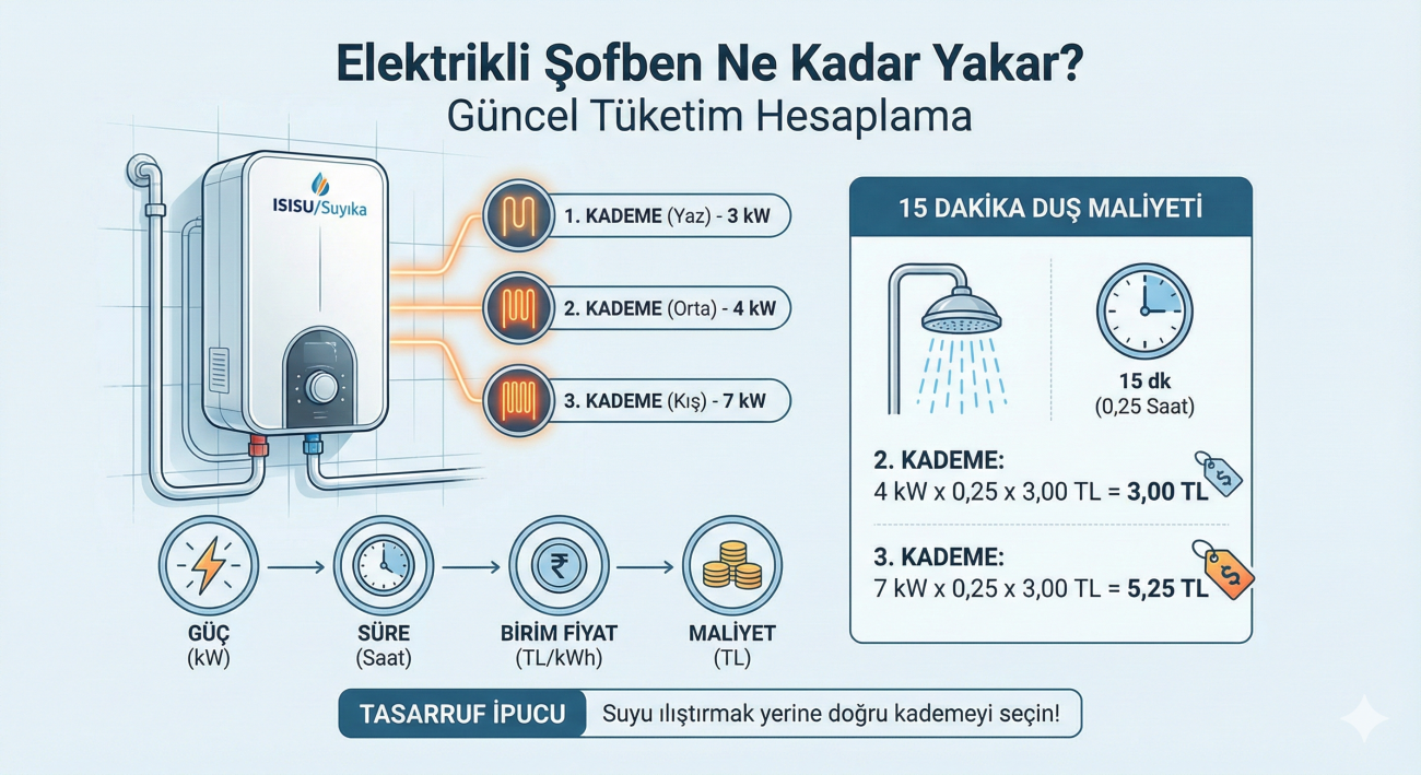 Hesaplamaya geçmeden önce cihazın teknik verilerini bilmeliyiz. Standart bir ev tipi elektrikli şofben (örneğin Suyıka modelleri), genellikle 3 farklı ısıtma kademesine sahiptir. Her kademe farklı miktarda elektrik çeker: